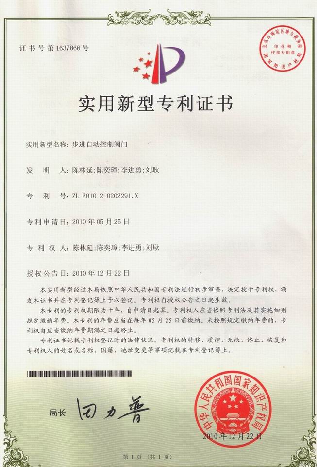 步進(jìn)自動(dòng)控制閥門(mén),專(zhuān)利號(hào):ZL 2010 2 0202291.X