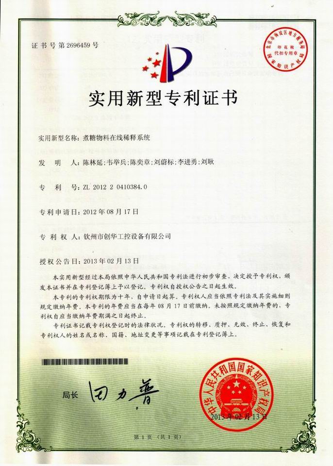 近日,我公司自主研發(fā)的“煮糖物料在線稀釋系統(tǒng)”獲得國家知識產(chǎn)權(quán)局實用新型專利授權(quán)。本系統(tǒng)是我公司針對糖廠目前在結(jié)晶過程中間歇入料,不能做到沸點入料及任意錘度稀釋的現(xiàn)狀而自主研發(fā)的,該系統(tǒng)安裝在原料箱和煮糖罐之間,通過PLC控制,實現(xiàn)入料溫度可調(diào),入料錘度可調(diào),并且在結(jié)晶過程中能實現(xiàn)連續(xù)入料,為結(jié)晶過程的平穩(wěn)進(jìn)行創(chuàng)造有利條件。該系統(tǒng)的應(yīng)用,對于糖廠節(jié)能降耗和提高回收有一定的幫助。